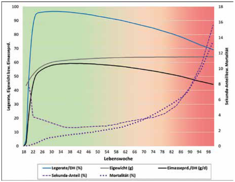 Die Verlängerung der Haltungsdauer von Legehennen über die bisher üblichen 70-75 Lebenswochen hinaus stellt die Halter vor Herausforderungen, besonders im letzten Drittel der Legeperiode (Abb. 1). Dazu gehören nachlassende Legepersistenz und Eischalenstabilität, steigende Mortalität, erhöhtes Risiko für Gefiederschäden und Hautverletzungen. Gezielte Maßnahmen sollten bereits in der Aufzuchtphase ergriffen werden, um eine optimale Qualität junger Hennen sicherzustellen, einschließlich der Verwendung von Kükenstarterfutter und angepasster Futterphasen. Die Transitphase (Einstallung in 16.-18. LW bis 35. LW) ist kritisch, da die Tiere hormonelle und physiologische Veränderungen erleben und gleichzeitig an Körpermasse zunehmen müssen sowie die Legeleistung stark ansteigt.