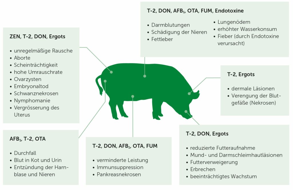 Mykotoxine sind giftige Stoffwechselprodukte, die von Schimmelpilzen z.B. auf dem Feld (Fusarien, Feldpilze) oder bei unsachgemäßer Lagerung (Lagerpilze) gebildet werden. Schweine, besonders Ferkel und Zuchtsauen, reagieren sehr empfindlich auf Mykotoxin-belastetes Futter. Die Auswirkungen von Mykotoxinen in der Schweinefütterung sind sehr vielfältig. Sie schwächen das Immunsystem, die Tiere werden krankheitsanfälliger und die Leistungsfähigkeit sinkt. Mykotoxine belasten vor allem Darm, Leber und Nieren und können Fruchtbarkeit und Wachstum bei Schweinen und Ferkeln verringern.