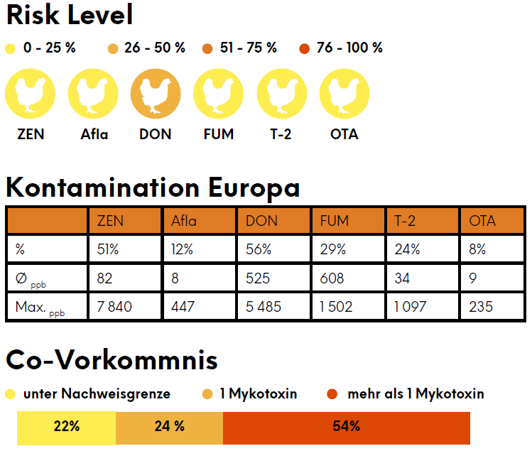 Am Forschungsstandort in Tulln verfügen unsere Teams über eine breite Expertise, die sich unter anderem mit der Entwicklung von mykotoxindetoxifizierenden Enzymen, der Darmgesundheit und dem Mikrobiom sowie der statistischen Analyse und Datenverarbeitung beschäftigt. Durch die interdisziplinäre Zusammenarbeit unserer Expertenteams erlangen wir ein tiefgreifendes Verständnis für die Bedürfnisse dieser Tiere. Wir stellen den dsm-firmenich’s World Mycotoxin Survey bereit – einen jährlichen Bericht, der eine große Anzahl von Futterproben aus der ganzen Welt analysiert, um Kontaminationsniveaus verschiedener Mykotoxine in einer Vielzahl von Futtermitteln zu verstehen und zu überwachen. Der Survey wird seit 2004 durchgeführt und gilt als der längste und umfassendste Datensatz zur Mykotoxin-Prävalenz. Der Bericht gibt Einblicke in das Auftreten der sechs wichtigsten Mykotoxine in den für die Tierfutterproduktion verwendeten landwirtschaftlichen Rohstoffen, um das potenzielle Risiko für die Tierproduktion zu identifizieren. Im Jahr 2022 wurden über 27.000 Proben aus 87 Ländern auf der ganzen Welt gesammelt und analysiert. Der Bericht steht zum Download zur Verfügung und enthält Informationen unter anderem zu den Prävalenzniveaus für jedes Mykotoxin in jeder Region, zu globalen und lokalen Risikostufen für jedes Mykotoxin, Risikolevels für einzelne Spezies oder den zehnjähriger Prävalenztrend für jedes Mykotoxin. Unser Bericht liefert nicht nur detaillierte Einblicke in das Auftreten der wichtigsten Mykotoxine in landwirtschaftlichen Rohstoffen für die Tierfutterproduktion, sondern identifiziert auch potenzielle Risiken für die Tiergesundheit. In der Abb. 2 ist exemplarisch das Mykotoxin-Kontaminationsniveau in Europa im Jahr 2023 sowie die entsprechenden Risikolevels für Geflügel dargestellt.