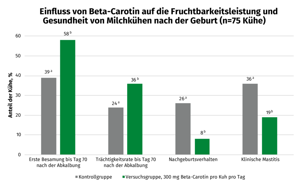 In einer wissenschaftlichen Studie mit 76 Kühen wurde der Effekt von Beta-Carotin auf die Fruchtbarkeitsleistung untersucht. Die Versuchsdauer erstreckte sich 21 Tage vor bis 70 Tage nach der Abkalbung. Mit dem Einsatz von Beta-Carotin stellte sich eine signifikante Verbesserung von Fruchtbarkeits- und Eutergesundheitsparametern ein.