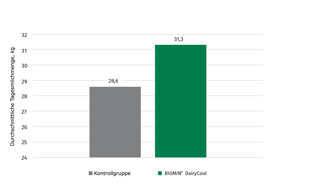 Auf einem Milchviehbetrieb in Oberösterreich wurde im Sommer 2017 ein Parallelversuch mit BIOMIN® DairyCool durchgeführt. In der Versuchsgruppe wurden für 3 Monate (Juni, Juli, August) 500 g BIOMIN® DairyCool pro Kuh pro Tag gefüttert. Die Kühe mit BIOMIN® DairyCool hatten über den Versuchszeitraum im Durchschnitt eine um 2,7 kg höhere Milchleistung als die Kühe in der Kontrollgruppe.