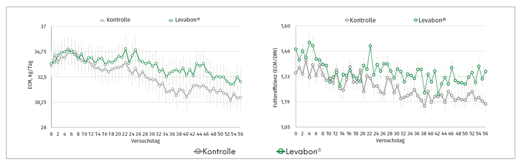 Die Supplementierung von Levabon® erhöhte die energiekorrigierte Milchleistung um 1,1 kg/Tag (P<0,01) und verbesserte die Futterreffizienz um 0,08 (P<0,01) in der Versuchsperiode.